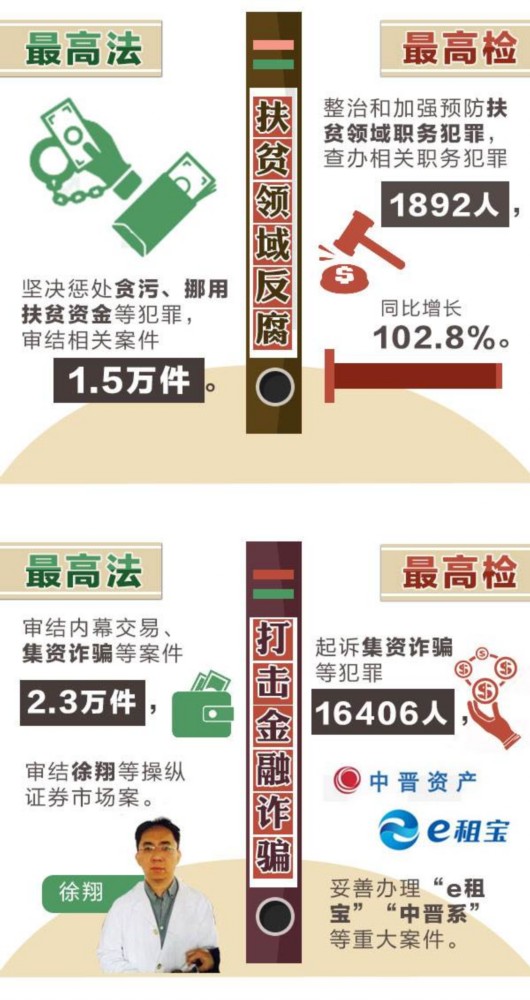 “贪占扶贫物资”“骗取扶贫资金”“精准扶贫识别优亲厚友”“倒卖扶贫物品获利”,抢穷人饭的扶贫“蝇贪”太招百姓恨。去年各级法院审结贪污、挪用扶贫资金等相关案件1.5万件,各级检察机关查办扶贫领域相关职务犯罪1892人。今年最高检提出要“继续集中惩治和预防扶贫领域职务犯罪”,并表示要同发改委、扶贫办共同对“十三五”易地扶贫搬迁重点工程项目开展预防监督,实行挂牌督办,贫困群众的权益将有更坚实的保障。
