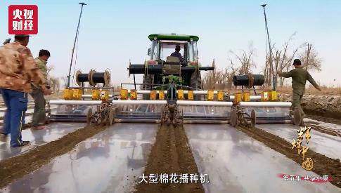 大型棉花播种机平均每台每天播种300亩,这是全球最快的棉田播种速度。