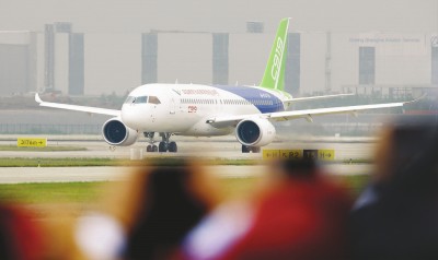▲中国首款国际主流水准的干线客机C919在上海浦东国际机场首飞成功(5月5日摄)。新华社记者方喆摄