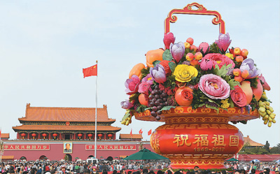 图为在天安门广场拍摄的“祝福祖国”巨型花篮。