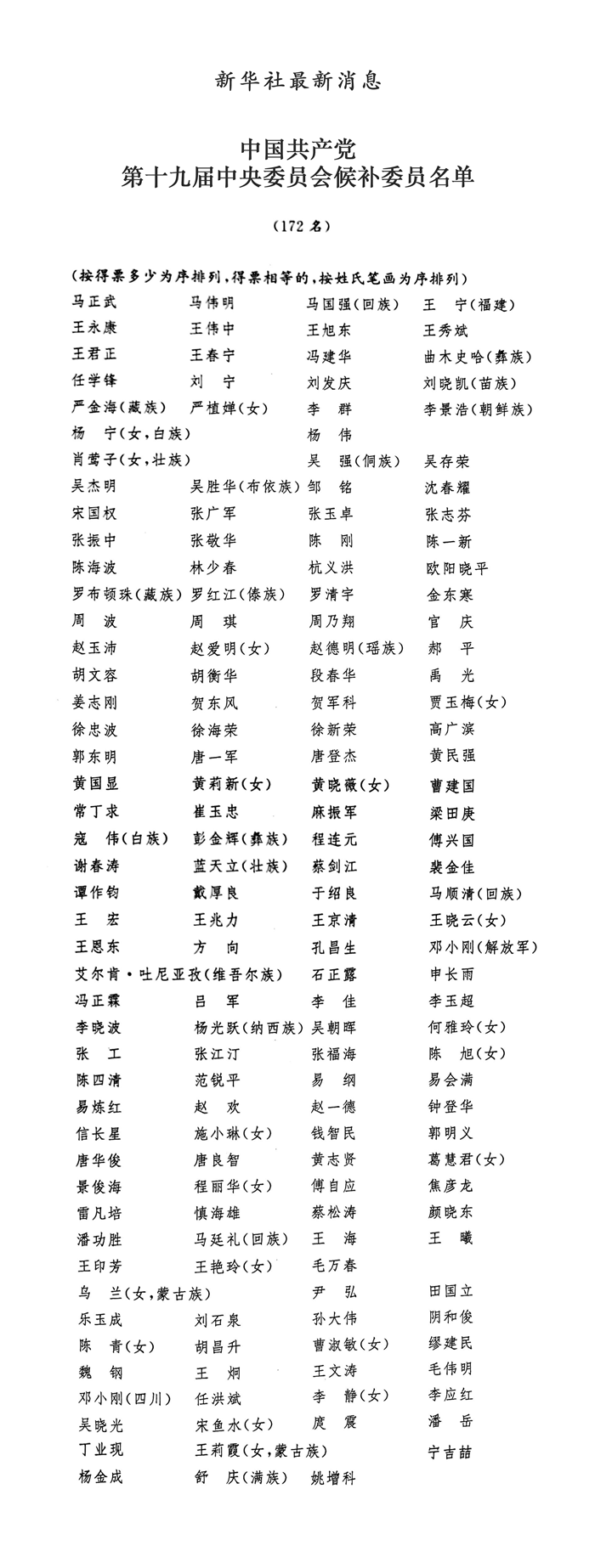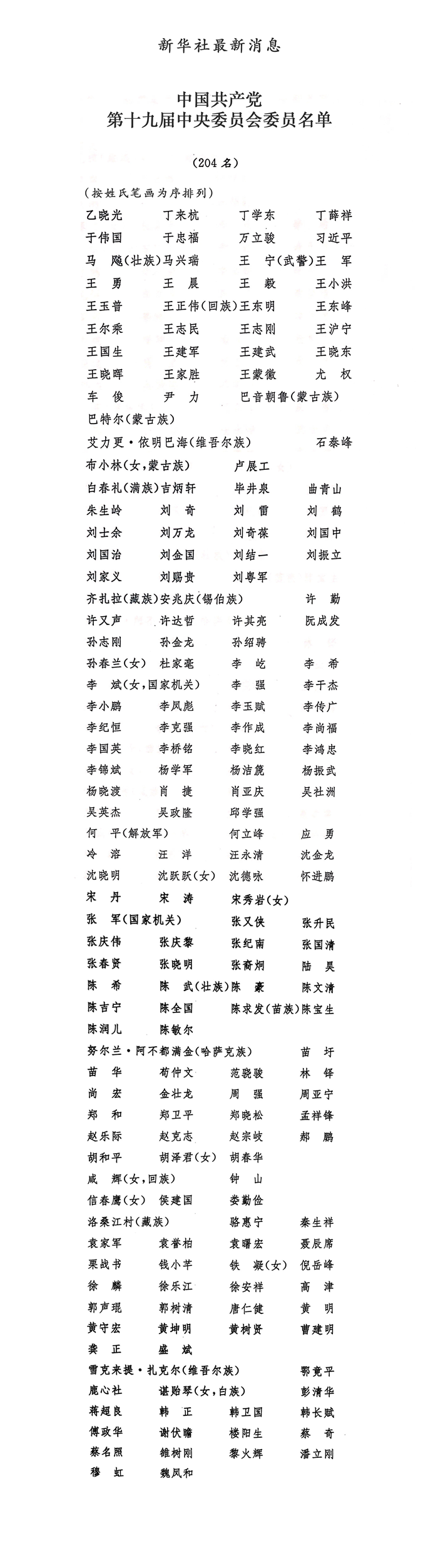 十九届中央委员、候补中央委员、中央纪委委员名单