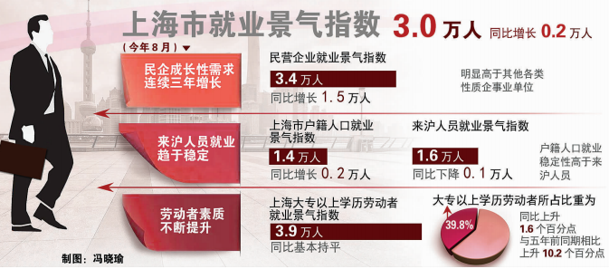 今年8月,上海大专以上学历劳动者就业景气指数为3.9万人,与去年同期相比基本持平。