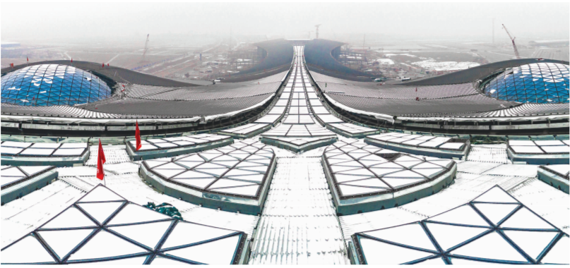 ▲北京新机场航站楼屋面披上一层银装。(均北京新机场建设指挥部供图)