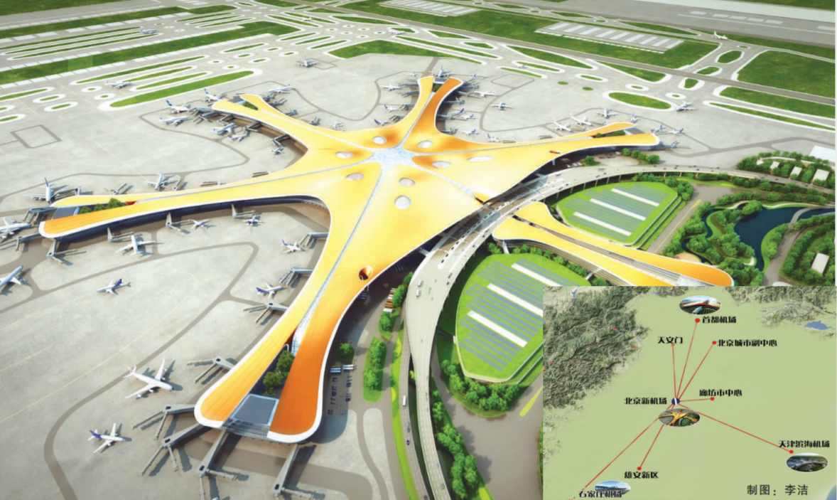 ▲北京新机场航站楼效果图,右下角小图为新机场地理位置示意图。