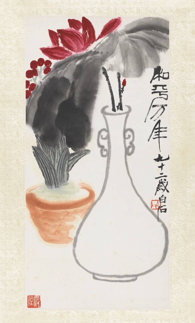 ▲齐白石 《和平万年》纸本设色 69×33.5cm 1952 中国美术馆藏