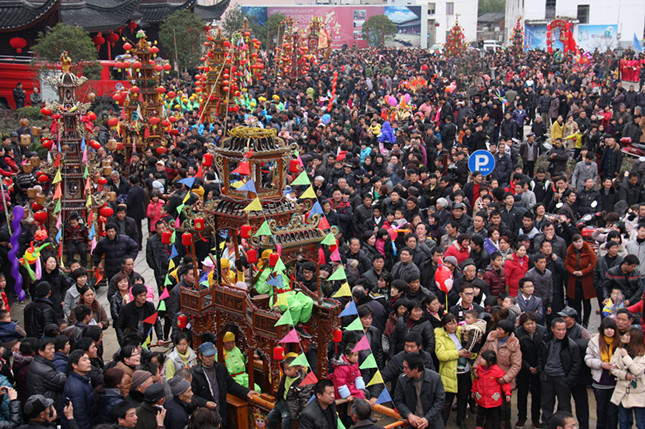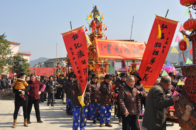 每年正月十四下午,准备行会游行的队伍全部集中到鼓亭馆广场,大旗、龙舞、狮舞、鼓亭、抬阁、秋千等将按照程序排放好。时间一到,烟花绽放,头牌在前,大旗引导,彩船队、鼓亭、抬阁、秋千与龙舞、狮舞紧随其后,一路上鼓乐齐鸣,炮声震天,人声鼎沸,整个队伍走街串巷向塔山庙进发。到塔山庙后,请出“濠公老爷”,游街串巷,察看田头,共欢乐庆丰收。行会队伍所到之处,童氏后人按规定摆上供品供请祖先,沿路随处有村民无偿供应水果、茶点给游人享用。当天,当地村民家家户户还裹汤包和麦饺筒、烙麦饼招待来自各地的客人,无论陌生或熟悉的,大家都可以品尝。晚上,游行队伍在鼓亭馆广场看烟花。同时鼓亭、抬阁、秋千都点上灯笼,家家户户挂灯结彩继续游行。十五日活动继续