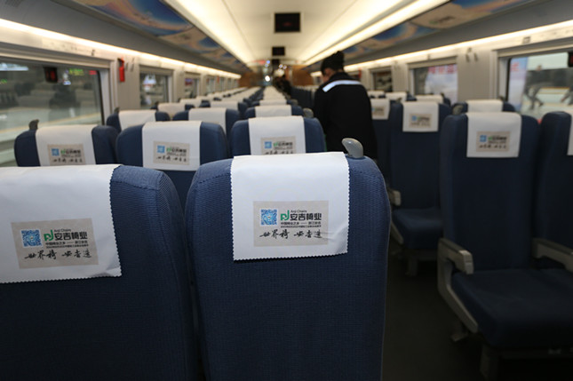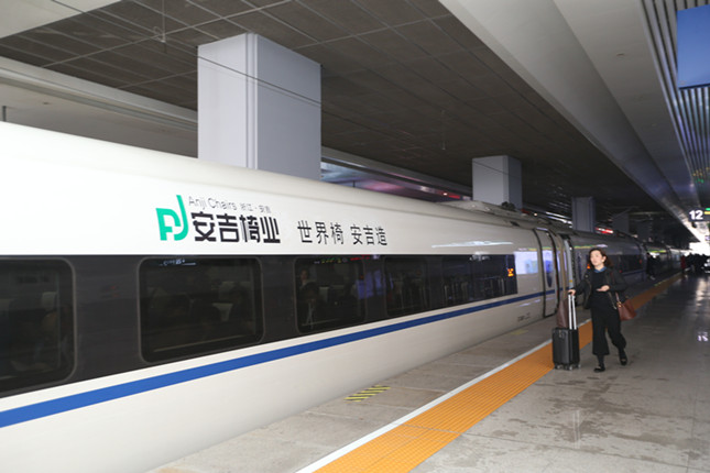 3月1日上午10点59分,首列“安吉椅业号”高铁专列风驰电掣般飞出上海虹桥高铁站奔向北京,与以往不同的是,这列高铁的每节车厢外都有醒目的“安吉椅业”四个黑色大字,车内内饰的头、背靠垫及小桌板、行李架,车厢内的LED滚动显示屏和动车组的进出站播音提示,皆被浙江安吉椅业企业元素和符号所包裹,成了一列流动的安吉椅业广告车。