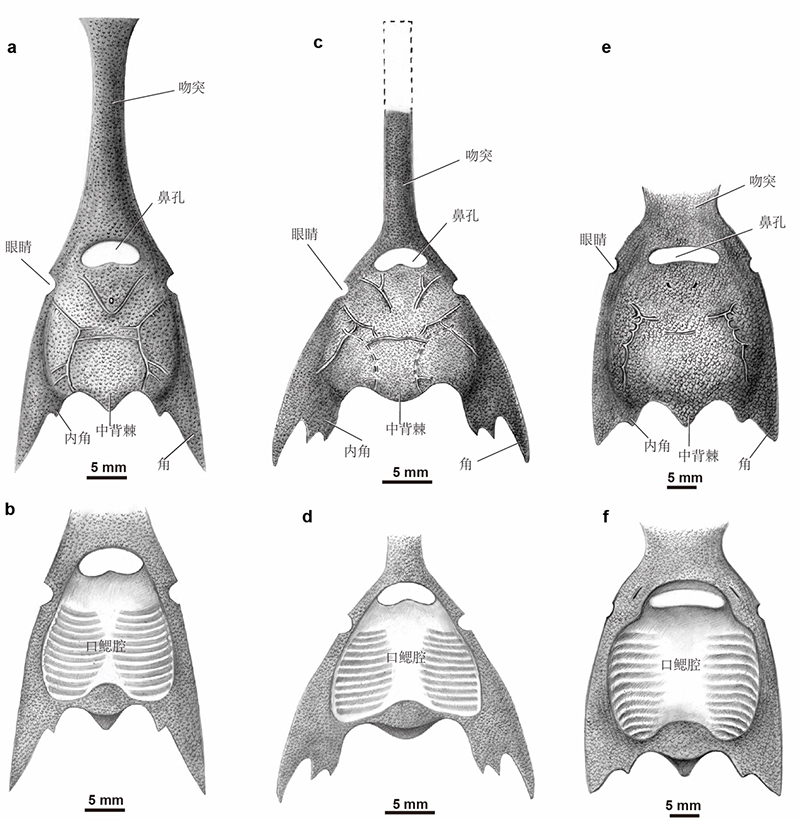 长吻三歧鱼在分类上属于无颌类盔甲鱼亚纲三歧鱼科,因其头甲形状如古代兵器三叉戟,前面吻突又极度延长而得名(吻突长度可达头甲中长的2.5),因此堪称泥盆纪海洋中游动的“三叉戟”。三歧鱼科在无颌类盔甲鱼中一直是一个神秘而独特的存在,其标志性的三叉戟形头甲和半月形鼻孔,很容易跟其他盔甲鱼类区分,目前仅含有1属3个种,分别是长吻三歧鱼、昭通三歧鱼和越南三歧鱼,堪称三歧鱼三兄弟。因此,三歧鱼科也是目前盔甲鱼类中唯一一个仅含有一个属的科级分类单元。长吻三歧鱼最初由盔甲鱼类研究第一人刘玉海先生1975年发现于四川江油龙门山雁门坝的泥盆纪地层,是世界上第一个具有完整身体保存的盔甲鱼类。同期刘玉海先生也报了发现于云南北部昭通地区同时期的昭通三歧鱼。云南昭通和四川江油在地理位置上离的很近,都属于华南板块北部,因此长期以来一直认为三歧鱼的生活区域可能仅局限于华南板块的北部。直到2002年赵文金等人在滇东南文山发现了长吻三歧鱼和2009年法国古生物学家菲利普.让维埃在越南北部发现了越南三歧鱼,人们才意识到三歧鱼分布范围比原来想象的要广泛,可能是盔甲鱼类中分布最为广泛的一个属种。 但是在三歧鱼的南北地理分布上,存在上千公里的地理间隔,对于游泳能力较弱,营底栖生活的三歧鱼是怎样完成了长距离的迁徙,一直是困扰古生物学界的未解之谜。此次长吻三歧鱼在云南曲靖“古鱼王国”的首次发现,不仅扩大了三歧鱼在华南板块的分布范围,而且曲靖地区恰好处在江油地区和越南北部地区之间的位置上,填补了三歧鱼南北分布的地理空白,为研究三歧鱼的南北迁徙路线提供了重要资料,因此又具有独特的生物地理意义。