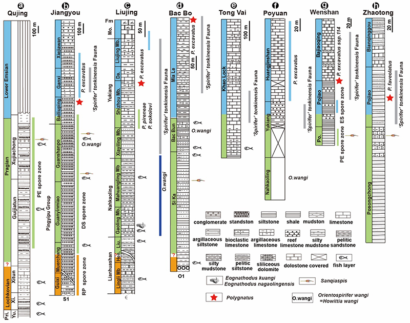 长吻三歧鱼在曲靖的发现也具有非常重要的生物地层意义。三歧鱼是盔甲鱼类中唯一一个同时出现在云南曲靖徐家冲组、云南文山、昭通的坡松冲组、四川江油关山坡组、越南Si Ka组和广西南宁那高岭组的盔甲鱼类,从而为它们之间的对比,提供了最直接的古鱼类学证据。特别是越南Si Ka组的越南三歧鱼,因其与廖角山多鳃鱼共生在一起,法国著名古生物学家菲利普.让维埃一直认为其出现的时代比中国的三歧鱼出现的时代要稍早一些,属于早泥盆世洛赫考夫期(约4.2亿年前)。但是,近年来的古生物化石证据显示,廖角山多鳃鱼的延续时代较长,可能从早泥盆世洛赫考夫期(约4.2亿年前)一直延续的早泥盆世布拉格期(约4.1亿年前)。三歧鱼是徐家冲组合的重要成员,通过对我国华南和越南北部早泥盆世的8个含鱼地层的综合对比表明,这些非海相三歧鱼所在的地层可以与广西六景段莲花山组和那高岭组之间的过渡层进行对比(图5),而那高岭底部含有时代明确的布拉格期牙形类标准化石。因此,越南北部的 Si Ka组中上部和广西的莲花山组上部的年代应该是布拉格期,而不是洛赫考夫期。华南板块布拉格期的古鱼类化石组合详细记录了盔甲鱼类尤其是华南鱼目在早泥盆世的快速辐射演化。