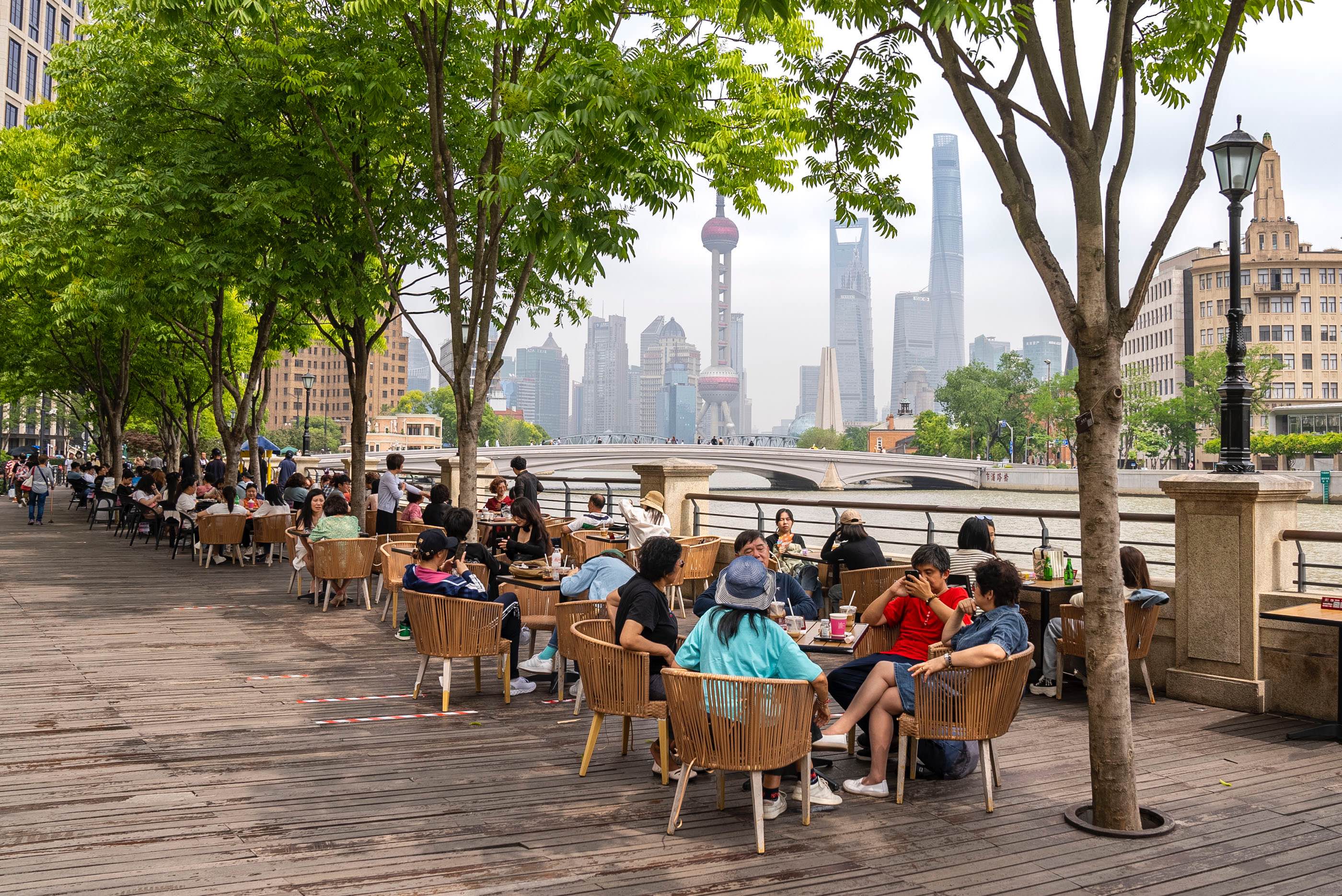 ▲苏州河沿岸的咖啡店将桌椅移到户外临河处,市民游客在此小聚,边喝咖啡边欣赏外滩和陆家嘴美景,尽享闲暇时光。 周俊超 摄