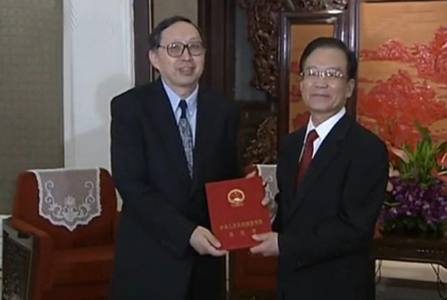 2012年6月15日,原中共中央政治局常委、国务院总理温家宝向陈来颁发中央文史馆馆员聘书