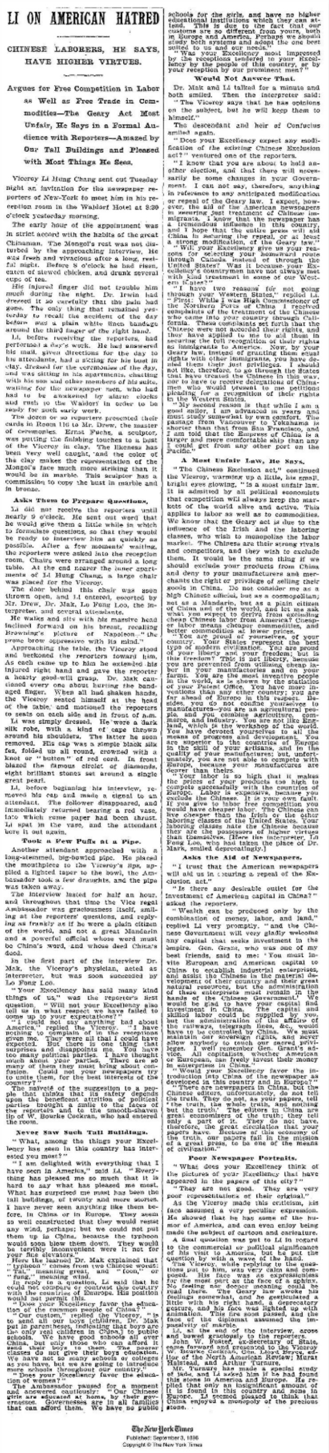 1896年,73岁的李鸿章奉清朝朝廷之命出使俄国参加沙皇尼古拉二世的加冕礼,顺访欧美列国,此行共历190天,行程9万里。当地时间1896年8月28日,李鸿章一行乘“圣·路易斯”号邮轮抵达美国纽约,对美进行了为期十天的访问。李鸿章是第一位东方访美高官。引发纽约万人空巷。其后,他接受了《纽约时报》记者半小时的专访,全文刊发在1896年9月3日的《纽约时报》上,其中谈及中美教育制度、基础建设,尤其谈到了排斥华工的《吉利法案》(又译《排华法案》)。“以史为鉴,可知兴替”。现全文刊发报道,并附英文原文PDF版。