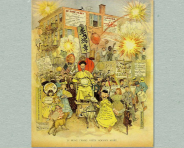▲理查德·费尔顿·奥特科特的《李鸿章访问霍根街》,出自连载漫画《霍根街》。刊登于1896年9月6日《纽约世界报》。