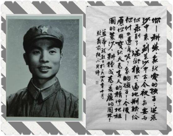 军营中的蓝耕荒(左)、蓝蒂裕烈士就义前夜写给蓝耕荒的诗《示儿》(右)
