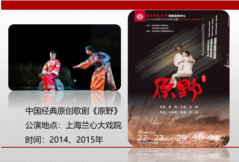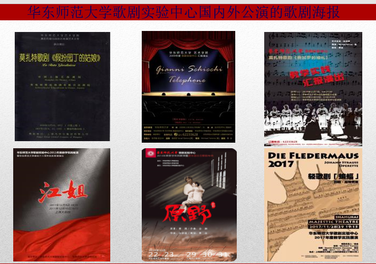 作为全国首个成立歌剧实验中心的综合性大学,华东师范大学歌剧实验中心自2006年成立以来,坚持推陈出新,不断创造精品,利用不足专业院团1/10的经费,联合学校交响乐团、合唱团陆续排演了七部中外经典歌剧全剧和数百场具有专业水准的歌剧片段及专场音乐会。在不断的实践与摸索中,形成了富有特色的教学模式,成果丰硕。无论在人才的培养,教学体系的建立,文化的推广,社会服务等各方面,都默默地开花,默默地结果。
