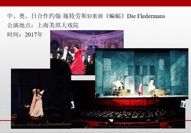 2009年,我们同时推出了梅诺蒂的《电话》和普契尼的《贾尼·斯基基》两部歌剧。在此基础上,2017年,华东师范大学排演的约翰·施特劳斯轻歌剧《蝙蝠》迈向了一个新的台阶。中、奥、日三国合作,并首度采用以本校师生为主体,面向国内外招聘主要角色演员的机制,以广泛调动国内外优秀的青年专业人才,提高歌剧演出质量,扩大演出的社会影响力。该剧的最大亮点是创新性地加入了四川变脸,将西洋歌剧与中国民族元素完美融合,形成了又一个华东师范大学版不可复制的保留剧目。