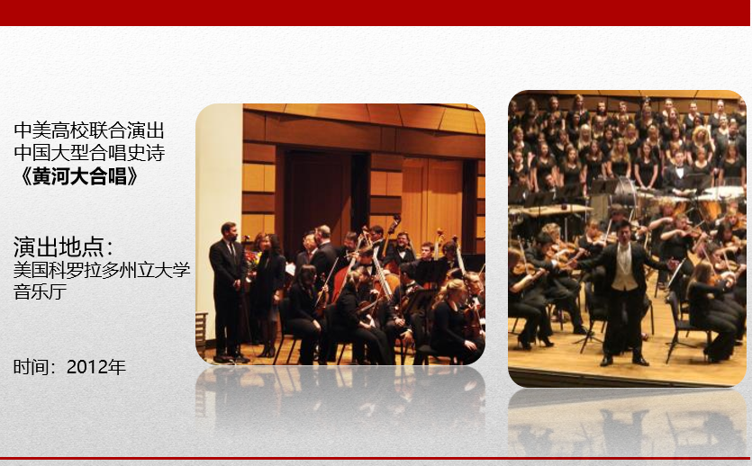 2010年在美国由华东师范大学师生领唱,美国高校学生用中文合唱,中美高校师生共同演绎完成的中国经典合唱史诗《黄河大合唱》更是具有历史意义的世界首演。美国高校学生对中国的音乐作品知之甚少,尤其是合唱。《黄河大合唱》唱段多,音区高,旋律变化快,这对毫无中文基础的美国学生而言的确不易。然而我内心的声音告诉我,自己是学西洋歌剧的,我们经常用各种各样欧洲语言演绎他们的作品,为什么他们不能用我们的语言来演唱中国经典?因此,我们大胆地进行了尝试,经过中美两国一百余名师生共同努力,我们成功地将中美合作版《黄河大合唱》搬上了美国艺术舞台,这是一次非常有意义的演出。