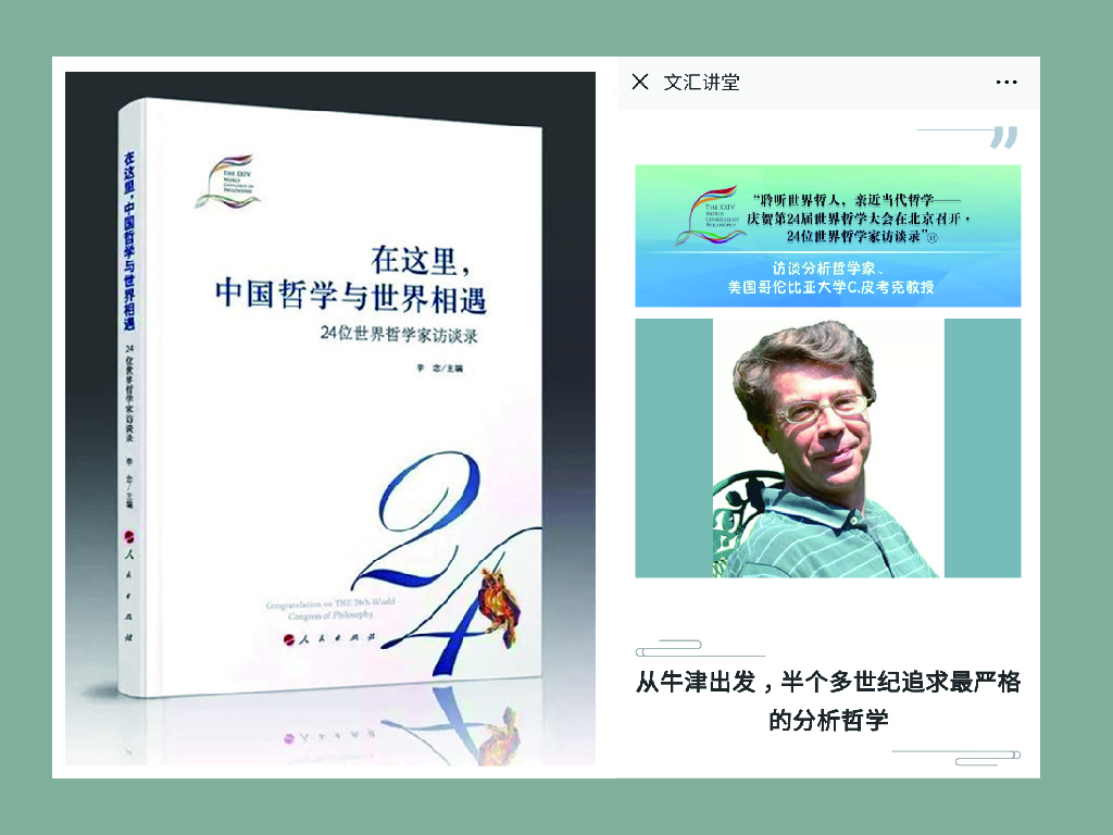 文汇讲堂第五本专著《在这里,中国哲学与世界相遇——24位世界哲学家访谈录》(左);2018年8月11日,文汇讲堂公众微信刊发皮考克的访谈(右)