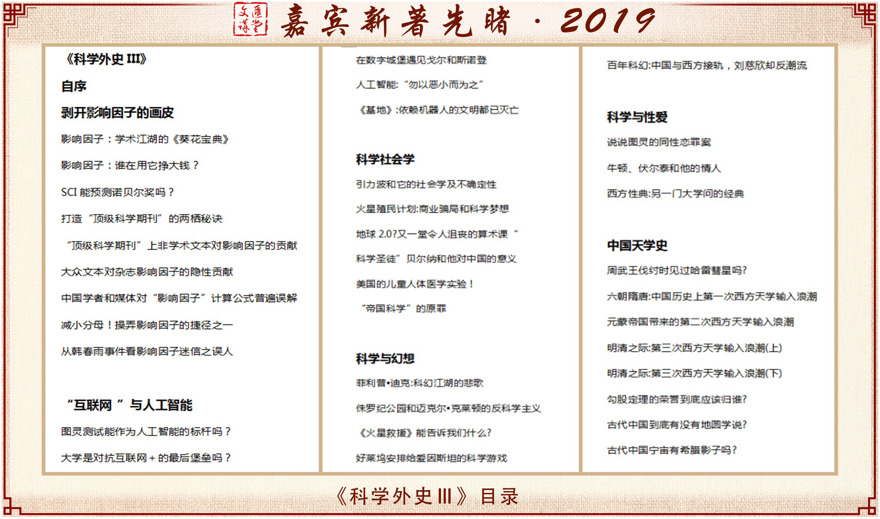 以“科学外史”专栏每年12篇的速度,我大约需要三年才能产出编一册的文章,现在编第三册的文章已经绰绰有余,所以这次我选了36篇编成《科学外史·Ⅲ),仍然不受发表顺序约束,而是根据主题将文章分成六组。
