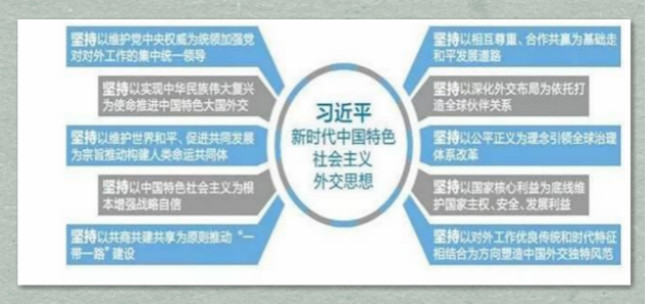 党的十八大以来,习近平总书记在系列讲话中对国际关系的发展和我国的外交战略作了新的论述,其要点是:(1)和平、发展、合作、共赢仍是时代潮流;(2)坚定不移走和平发展道路;(3)打造人类命运共同体;(4)积极实施共建“一带一路”;(5)推动与各方关系全面发展;(6)坚决维护国家核心利益;(7)推进全球治理体系变革;(8)中国改革不停顿,开放不止步。