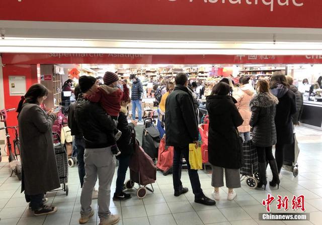 在“封城”前夜,大批民众在巴黎的超市排队抢购生活必需品。(图源:中新社)