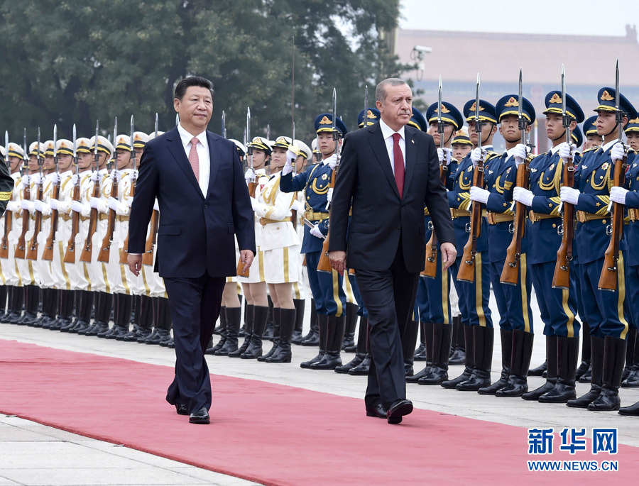 2015年,7月29日,国家主席习近平在北京人民大会堂同土耳其总统埃尔多安举行会谈。这是会谈前,习近平在人民大会堂东门外广场为埃尔多安举行欢迎仪式。(图源:新华社)