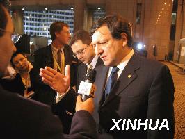 2004年12月16日,在比利时布鲁塞尔,欧盟委员会主席巴罗佐(右一)接受记者采访。为期两天的欧盟首脑会议16日晚在布鲁塞尔开幕,会议决定在2005年10月3日正式启动土耳其的入盟谈判。(图源:新华社)