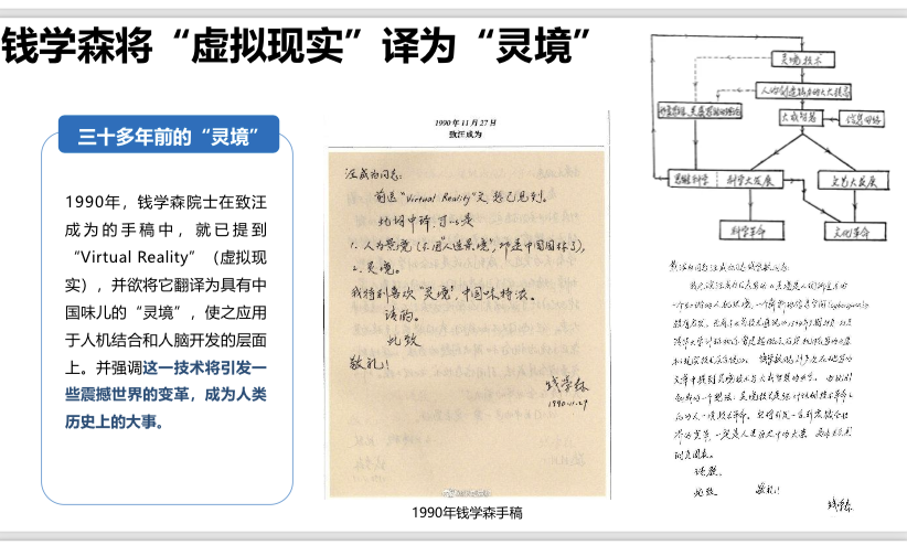 从中国科学发展史看,早在1990年,钱学森院士在致汪成为的手稿中就已提到“Virtual Reality”(虚拟现实),并翻译为具有中国意蕴的“灵境”,他预见这一应用于人机结合和人脑开发的技术将引发一些震撼世界的变革。