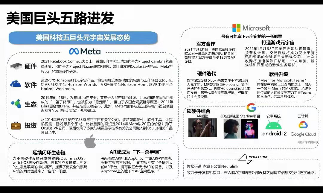 一是去年美国军方花费219亿美元购买微软的MR设备,这是迄今为止元宇宙中最大的合同。二是今年1月,微软花费678亿美元收购“动视暴雪”公司,这意味着微软通过收购大型游戏公司来完备其元宇宙战略,因为游戏和社交是元宇宙的先发之地,两者一旦结合就可以快速打造元宇宙的闭环生态。