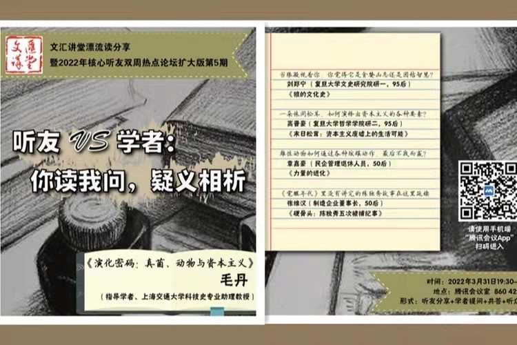 不同领域四本书,经由一条“演化密码”串联,随着“听友分享-学者‘三连问’-听众点评”的三剑聚合,打开了看世界的“第三只眼”。3月31日晚,申城疫情防控进入攻坚新阶段,上海以黄浦江为界展开防控,浦西实施全面封控的前一晚,文汇讲堂漂流读分享会第五期如期开展,本场活动邀请上海交大科技史专业助理教授毛丹作为指导学者。