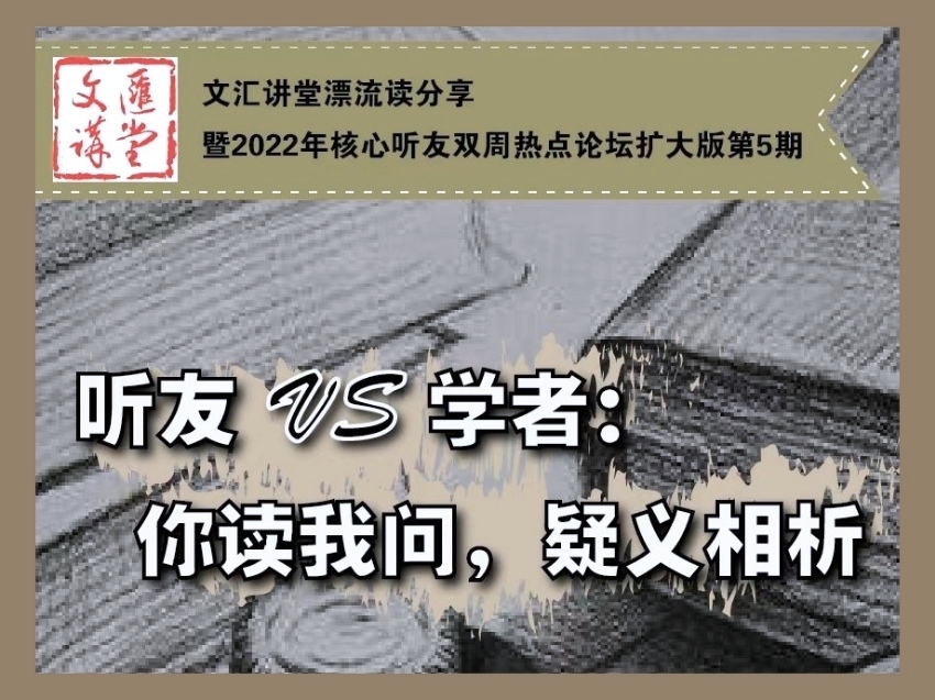 无论是“上阙”移步换景式的分享,还是“下阙”你来我往式的碰撞,参与者都在交流和体验之中,将读书“演化”到了更高维度。讲堂负责人、读书会主持人李念提到,不能否认读书仍然是辛苦的,分享前的准备也是逆水行舟的,纵然有听友的分享,但仍然不能代替阅读原著。为了给疫情中的阅读生活给予鼓励,文汇讲堂工作室特地准备了8本好书赠与参与分享会的听友,这场去年6月以线下文汇报读书讲堂支部发起的“漂流读义卖活动”又将开始新一轮“同道同行”,读书获启迪,以“读”防毒。
