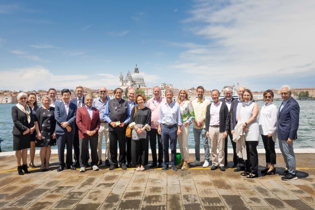 与会的政界、商界、学界精英在威尼斯合影。其中右起第9位为博古睿先生(Nicolas Berggruen),左起第12位为谷歌前CEO埃里克·施密特( Eric Schmidt),左11为威尼斯大学校长李集雅(Tiziana Lippiello),左10为前世界贸易组织(WTO)总干事帕斯卡尔·拉米 (Pascal Lamy),左9为联合国前副秘书长、印度前外交部长沙希·塔鲁尔(Shashi Tharoor)、左7为新加坡前驻联合国代表、前联合国安全理事会主席马凯硕(Kishore Mahbubani),左5为中国企业家、创新工场董事长兼CEO李开复,左1为博古睿研究院执行副院长中川黎明(Dawn Nakagawa);右8为丹麦前首相赫勒·托宁-施密特(Helle Thorning-Schmidt),右7为Snapchat联合创始人兼CEO埃文·斯皮格尔( Evan Spiegel),右6为新加坡前外长杨荣文(George Yeo),右5为前澳大利亚总理陆克文(Kevin Rudd),右2为博古睿研究院副院长、中国中心主任宋冰,右1为墨西哥前总统埃内斯托·塞迪略(Ernesto Zedillo)
