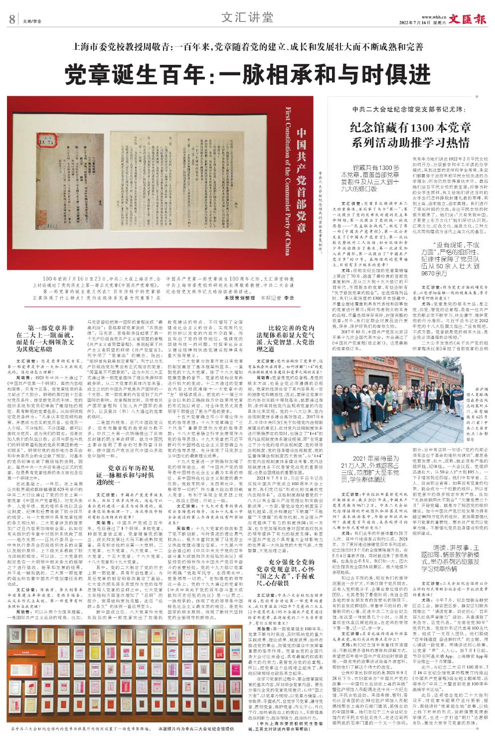 【导读】100年前的7月16日至23日,中共二大在上海召开,会上讨论通过了党的历史上第一部正式党章《中国共产党章程》。第一部党章的诞生意义何在?百年历程中的党章修正案体现了什么特点?党内法规体系完善为何重要?在中国共产党第一部党章诞生100周年之际,文汇讲堂特邀中共上海市委党校科研处处长周敬青教授、中共二大会址纪念馆党支部书记尤玮给读者做讲述。策划整理 文汇报记者李念。此篇为周敬青教授的讲述,见报标题为《党章诞生百年:一脉相承和与时俱进》