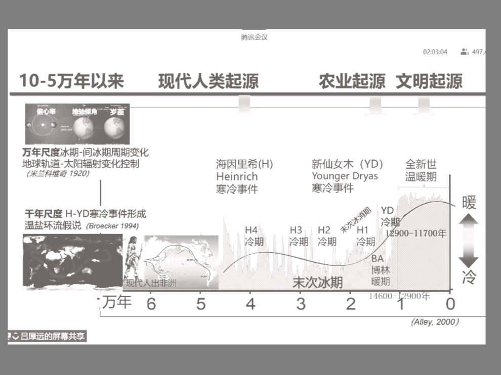 10万年以来的这个时段,涉及到世界考古学的三大议题——现代人类起源、农业起源和文明起源。这个时期气候变化表现为两类特点,一类是万年尺度的气候变化过程,从寒冷的冰期到温暖的间冰期,是由地球轨道变化控制的。第二类是千年尺度快速的气候变化,一般认为是由大洋温盐环流控制的,包括发生的一系列海因里希(H)寒冷事件、新仙女木(YD)寒冷事件。