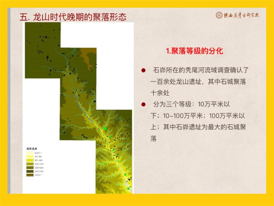 仰韶时代晚期聚落多选址在靠近河流的平缓山丘上,规模多在1-30万平方米,虽然之间出现等级差异,但规模差异并不悬殊。公元前2500年,进入龙山时代早期。遗址规模差异逐渐显著,50万平方米之上的遗址数量显著增多,但仍是一种多中心、对抗式的聚落分布形态。到了龙山时代晚期,以神木石峁遗址所在的黄河一级支流秃尾河流域为例,调查确认了一百余处龙山时代的遗址,根据面积可分为三个等级。小型聚落面积在10万平方米以下,中型在10-100万平方米之间,大型的是超过100万平方米,最大的就是面积超过400万平方米的石峁,已经形成了“众星捧月”的空间布局和类似于金字塔式的等级结构,石峁成为了区域中心。