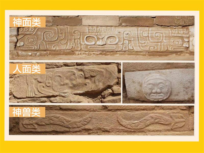 在长达130米长的南护墙上发现有70余件精美的石雕,由于部分墙体已坍塌,有些石雕在倒塌的堆积里,有些仍镶嵌在墙面之上。这批石雕的发现超出了我们对龙山晚期文明高度的判断,刷新了对早期艺术的认知。石雕的内容可分神面、人面、动物、神兽等几类。神面石雕普遍体量较大,往往采用对称的构图,中间为一张完整的正脸,两边仅刻半张脸,表现的是侧脸的形象。人面的头顶上不见华丽、夸张的装饰,比较写实,有的甚至表现出胡须等细部特征,人面的出现或许代表先民自我意识的觉醒。动物大多比较写实,能够看到牛、马、蛇等动物形象;神兽可见有早期龙的形象,和二里头发现的绿松石龙非常相似。