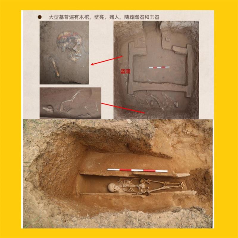 龙山时代晚期,墓葬之间的规模差异更加明显,大型墓葬墓室的面积往往能达到10平方米左右,有着丰厚的随葬品和木棺等葬具,在棺外还有殉人和殉狗。高等级墓葬普遍有壁龛,放置有成组的陶器,一些还饰有彩绘,墓主人身上还佩有玉器。小型墓葬面积不足1平方米,仅可容身,基本不见随葬器物。墓葬规模的巨大差异也显示出了死者生前的身份地位和占有社会资源的差异。