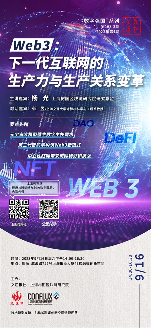 数字强国系列163-3期主讲嘉宾上海树图区块链研究院研究总监杨光,携手上海交大计算机科学与工程系教授郁昱,和你一同探讨这个已经到来的未来世界。早到观众同样可获得NFT数字藏品。