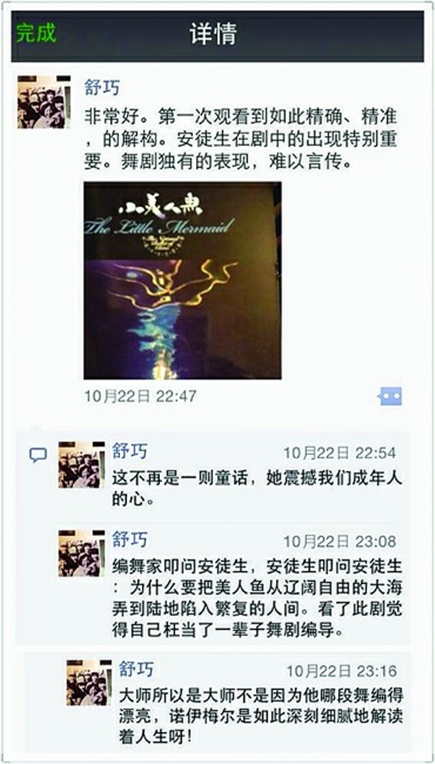 10月22日22:47,我国舞剧编导大师舒巧在她的“微信朋友圈”上上传了一张剧照,并点评说:“非常好。第一次观看到如此精确、精准的解构。安徒生在剧中的出现特别重要。舞剧独有的表现,难以言传。”