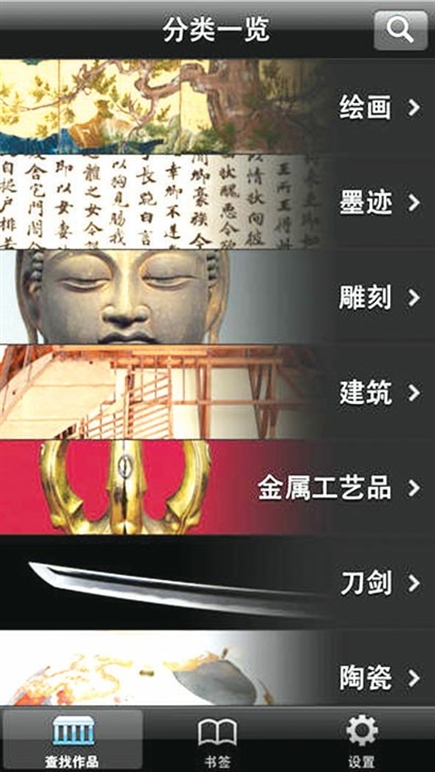 所谓团结就是力量,这款App集合东京国立博物馆、京都国立博物馆、奈良国立博物馆、九州国立博物馆4所博物馆馆藏的约1000件国宝,配以高清图片以及解说,支持放大浏览。部分的绘画经卷,可以从卷首至卷末连成一体,无缝浏览,非常畅快。同样是一款设计中正的App,支持分享和中文解说,不过它还有书签功能和搜索功能,方便随时调出浏览,更为贴心。 (图②)