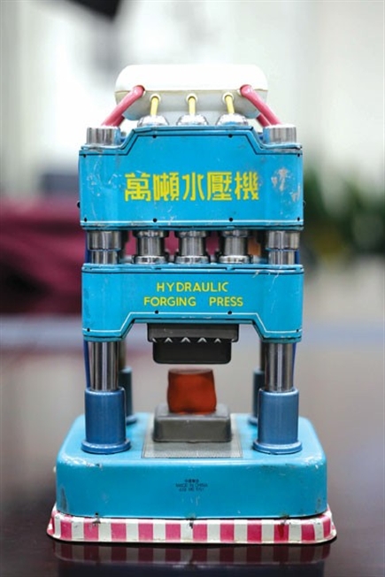 据它的设计师康元玩具厂老员工倪巡介绍,这款别具一格的玩具设计源自他一次参观上海江南造船厂的经历。我国自主研发的1.2万吨水压机让他深感震撼。如何在玩具设计中融入现实教育意义,让小朋友在把玩的过程中学习相关知识,了解我国工业发展的最新成就。为此,他耗时半年进行研究设计,既保留高压水箱、横梁立柱等基本元素,等比例缩小,还原机器真实外观,同时又简化真实机器运作过程,增加玩具的趣味性,只表现水压机上下运动时,其指示灯发出红光,底座上的仪表盘则变化显示“6000吨”“12000吨”。玩具批量生产后,一度成为全国小学、幼儿园的重点教具。