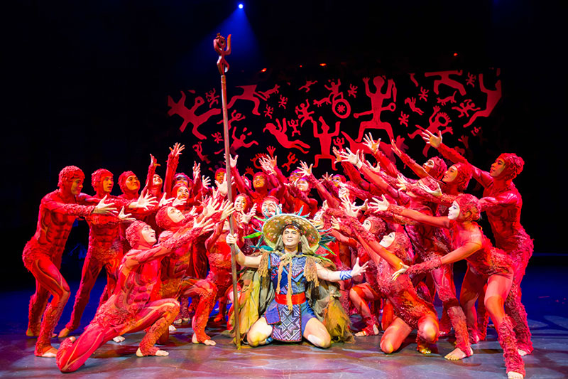 扎扎实实的证明之二,就是这岩画音乐舞蹈诗《花山》。据介绍,该作品取材于广西左江花山岩画,岩画表述了壮族先民最初的生命印象……其实上世纪90年代我去过左江,看过这岩画,真的是“最初”得很,完全“印象”。那“印象”刻在岩壁上,你诗意一点可以书写成什么“遥远的呼唤……”之类,但实际提供给编舞者的仅仅是完全单线条的间距,稀疏得一个个类似上下倒转的“出”字或者说“蛙”状的朱红色人形,画笔简朴至极,乍眼看去甚至不比驴友们胡乱刻的“到此一游”更夺目。当时曾有当地领导找我,希望将其排成舞剧,我拒绝了——这么单薄的一点点(素材)感觉无法做文章。所以,当今年赵明告知我接了这个命题时,我说快别排,就那么一个简单字形能排什么舞?!但赵明终不是迂腐的我,他以饱满的热情、宗教般的虔诚追寻、解密、想象,进而以男人、女人,图腾青蛙、花山四个篇章展开了一场对壮民族历史的文化探索。最为可贵的是这四个篇章那么多的舞段包括多段双人舞,都紧扣倒写“出”字形这个古老岩画上的迹像,由这个“形象动机”而衍化发展出一系列舞蹈语汇。这样的编舞非常吃功夫,但这样的编舞确保了《花山》自己独有的风格,而不与别个舞蹈诗雷同。要知道我们已经有过许多部表现少数民族的舞蹈诗了,而“雷同”则几乎是近年舞界创作的通病。