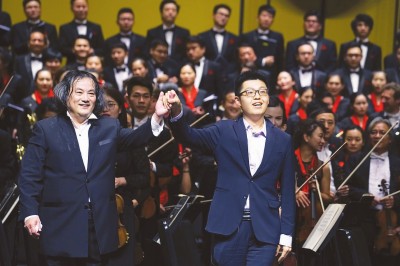 演出结束,指挥家汤沐海(左)与青年作曲家龚天鹏共同登台向观众致意。祖忠人摄