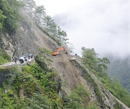 2012年6月26日下午,独龙江公路的养护工人用挖掘机清除塌方落石。 本报记者 戴焱淼摄