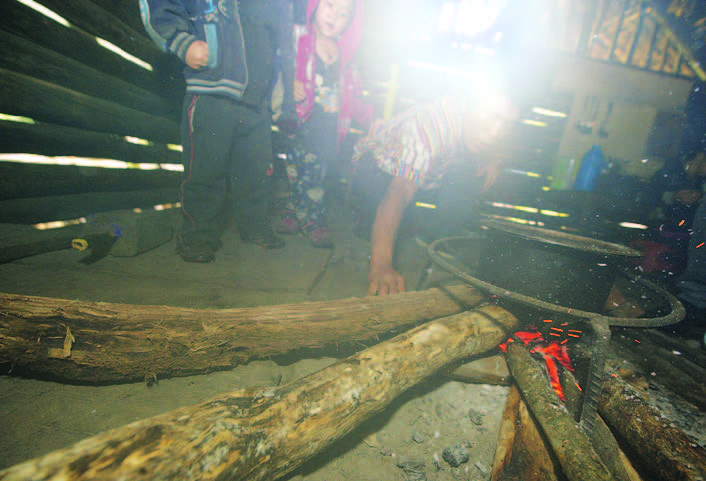 但是,阿西他们还是在屋外用木板搭起了伙房,那里不仅是厨房,还是生活的中心。伙房正中是常年燃烧的火塘,“我们改不了这个习惯,看到火塘,才会安心。”阿西说。