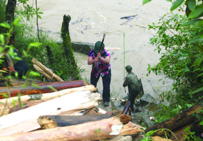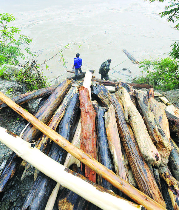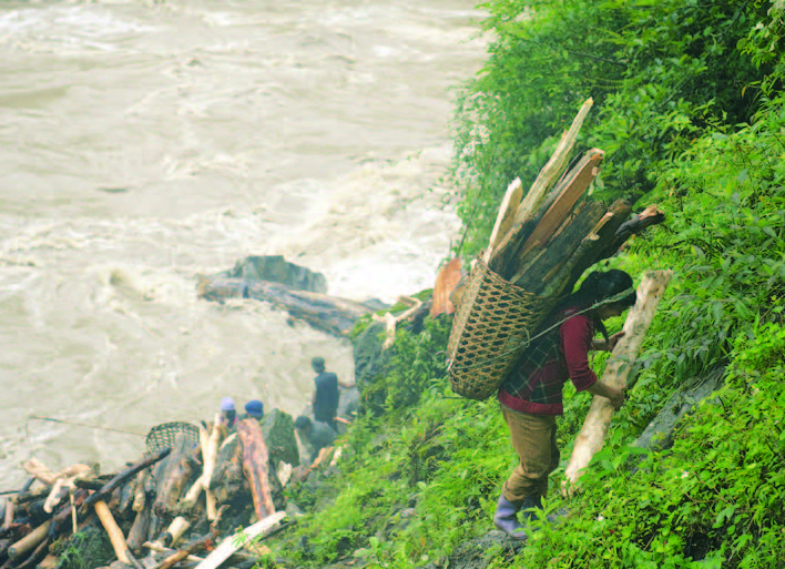 每年的6、7月间,独龙江的雨季到达顶峰,独龙江巨浪奔流。山区多滑坡,松散的泥土夹杂着树木、石头掉入江中,江水变成了“黄泥汤”。“汤”中自然少不了老于们的柴火。