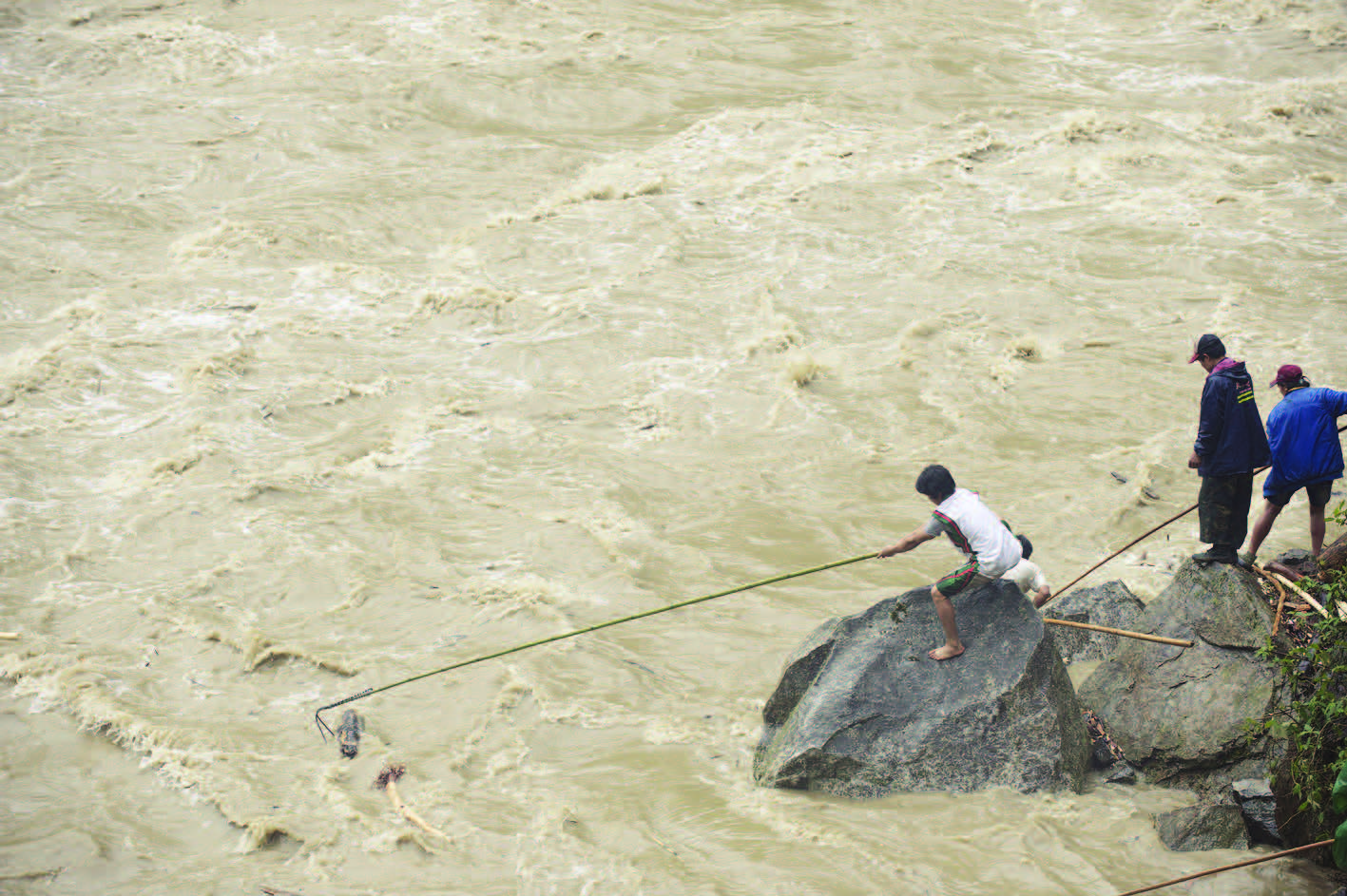 50岁的于双全,站在怒浪翻滚的独龙江里。几年来最大的一场洪水,让他兴奋不已。