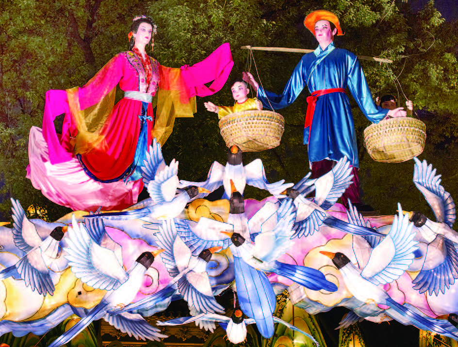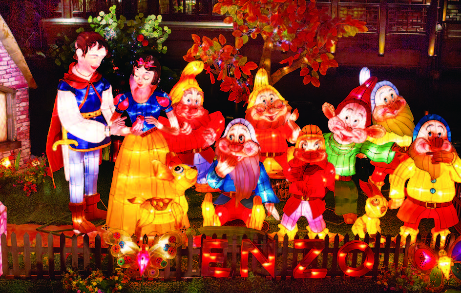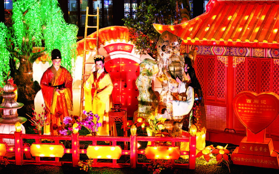 2014年元宵节是2月14日,恰逢西方情人节,中西方情人节相会在同一天,爱的恋曲谱写进行中。在九曲桥主题灯组上特别设计爱情元素,这里有传统的中国爱情故事,凤求凰、西厢记、牛郎织女、牡丹亭;这里也有西方的经典爱情故事,伊甸园亚当夏娃以及白雪公主和七个小矮人,期待让大家能体会到不一样的感觉。凝辉路南侧以“爱情街”为主题的气氛灯展示,成双成对正在亲密的蝴蝶灯、天鹅灯、鹦鹉灯将密布于上空。