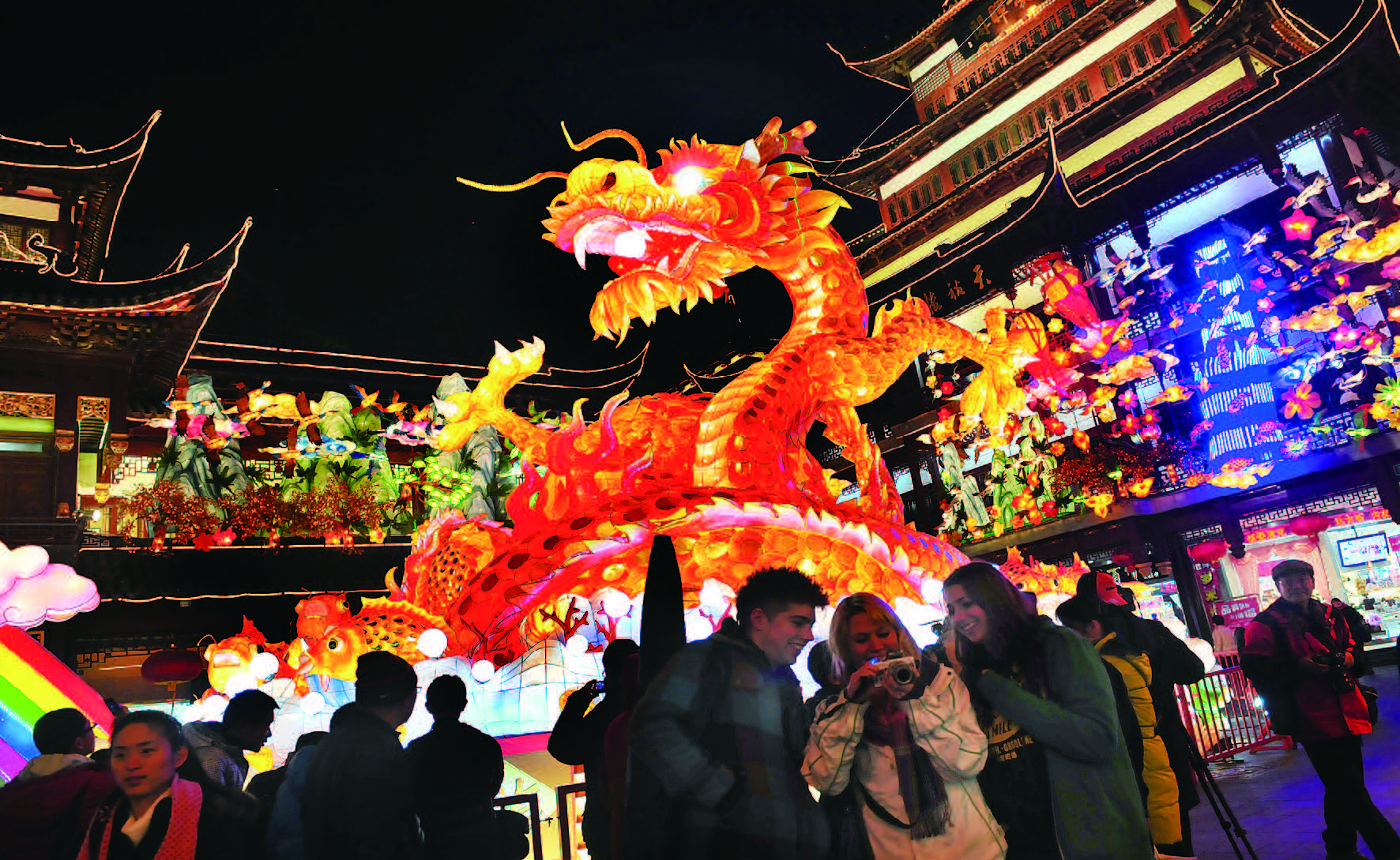 一直以来,九曲桥都是豫园里最具代表性的爱情圣地。数不清的中外情侣在此合影留念,并许下对未来美好的祝愿。有人说,元宵花灯是用来传情达意的最佳媒介,它让那些羞于开口的男女们有了一个吐诉心事的好时机。那么似乎在九曲桥,你能找到你想要的感觉。桃红柳绿、姹紫嫣红,美的让人心醉,美的让人忘乎所以。
