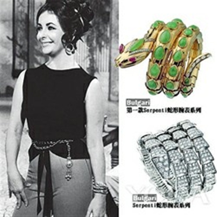 1962年在罗马拍摄《埃及艳后》的时候,伊丽莎白·泰勒戴着有名的“蛇表”,拍下了下面这张照片。这款黄金镶钻蛇形腕表就记录下了宝格丽Serpenti系列在1960年代最美艳的诱惑气场。而后,该系列转为自然元素加以风格化的表现,简洁括约,成为该品牌1970年代早期的核心主题。